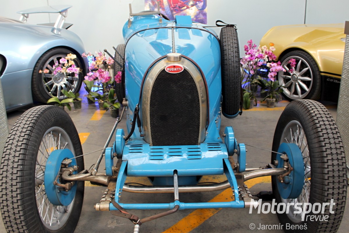 Závodní automobil Bugatti T35 navrhl a zkonstruoval Italo-Francouz Ettore Bugatti v roce 1924. Kromě skvělých jízdních vlastností se vyznačoval i nádhernou karosérií, který z něj rychle udělal oblíbený sportovní vůz pro bohaté a zároveň jeden z nejúspěšnějších soutěžních vozů všech dob. V Čechách, kam se dostalo jen asi patnáct kousků, ho proslavila Eliška Junková, když v roce 1928 obsadila páté místo v závodě Targa Florio. Plzeňané mohli závodnici v modré bugatce vidět během rychlostního závodu do vrchu na trase Lochotín-Třemošná.