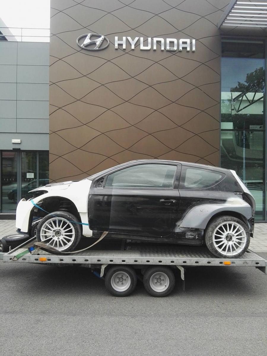 Rally simulátor Hyundai i20 WRC na cestě do lakovny.
