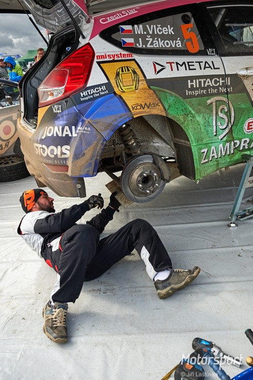 Pracovní harmonogram dostal trhlinu. Dalším bodem je servis, ale až za dvě hodiny. Co teď? Do Hvožďan je to skoro hodina jízdy. To nestíhám. Zbývají Svojšice. To je na přejezd cca 10 minut. Rozhodnuto. Na koukání pěkné místo, ale na focení nic moc. V táhlé levé trénuji panning. Alespoň že tady tolik nefouká. I sluníčko se občas ukáže. Po hodině to balím a vyrážím do servisu na letiště u Dlouhé Lhoty. Výdrholec. Než najedou auta do servisních boxů, stíhám teplý oběd. Balada. Tlačenice u některých boxů mne vrací do pracovního procesu. Fotím práci servisních techniků, rozhovory… Čas neskutečně letí. Itinerář soutěže je časově velmi kompaktní. Žádné velké proluky. Abych to stihl na erzetu do Březí, je čas vyrazit.